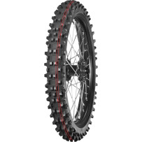 High-traction motocross tire for soft to medium terrain. Soft compound and optimized carcass improve control and durability. Mousse-compatible and identifiable yellow and red stripes.