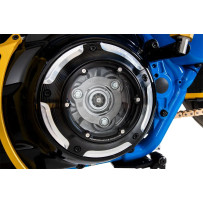 CNC-machined transmission cover with a polycarbonate lens for internal visibility. Lens resists hazing, yellowing and abrasions. Includes chrome gaskets and hardware.