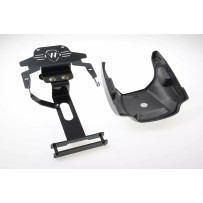 CNC-lasered license plate holder with durable powder-coat finish and integrated LED lighting (E-test). Low-profile design for easy installation.
