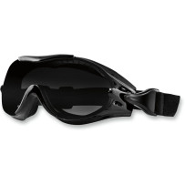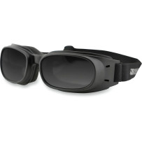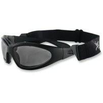 Convertible sunglass/goggle with soft foam backing, shatter-resistant lenses, anti-fog smoke option, quick-change lenses, strap and pouch included.