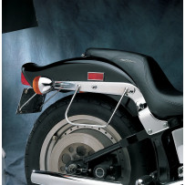 Chrome-plated support brackets keep throw-over saddlebags clear of the brake caliper and swingarm; include mounting hardware; sold in pairs. Not compatible with OEM detachable sissy bar or luggage rack.