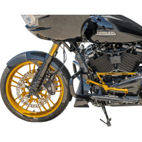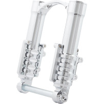 Precision CNC fork legs with tapered styling and hidden axle; accepts factory or aftermarket internals.